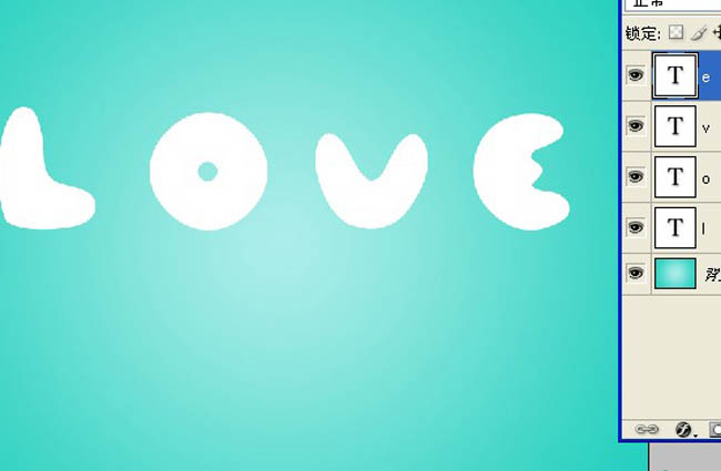 | 2、选择文字工具(t)然后分别在画布上打上LOVE 4个字母(每个字母一个图层)。 |