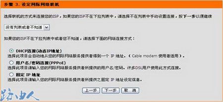 六、有三种方式选择:DHCP 连接(动态IP地址)、用户名/密码 连接(PPPoE方式)和固定IP地址连接方式,默认状态下为DHCP连接(动态IP地址)。