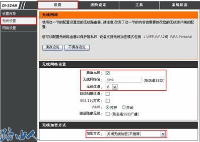 默认情况下DI-524M无线功能是激活状态,即开启D-LINK无线路由器后,计算机即可通过无线网卡找到该设备;默认的无线网络名(SSID)为dlink(能够搜索到该设备的名称);默认信道为6;默认无任何安全方式。