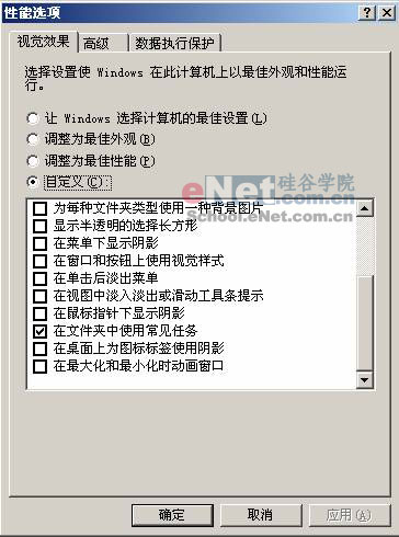 3> 右键单击我的电脑,选择“高级”标签。单击性能项里的“设置”按钮。在视觉效果项里先点击“调整为最佳性能”,然后在下面的复选项里选中“在文件夹中使用常见任务”。如下图所示: