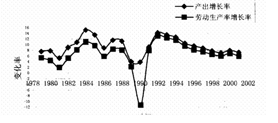 由于中国企业的有效就业率很低,因此宏观经济产出与企业劳动生产率息息相关。图3显示了1979-2003年间产出增长率与劳动生产率增长之间的关系,二者呈现非常明显的同向同幅度变动趋势,这充分表明我国企业的劳动生产率与经济增长之间呈正相关关系。理论和经验实证均表明,有效就业率与劳动生产率正相关,劳动生产率与宏观经济增长正相关。因此企业提高有效就业率,国民经济产出就迅速上升。无效就业在我国表现为在职失业或隐蔽性失业。由于历史和制度方面的原因,我国的总体隐蔽性失业情况严重。
