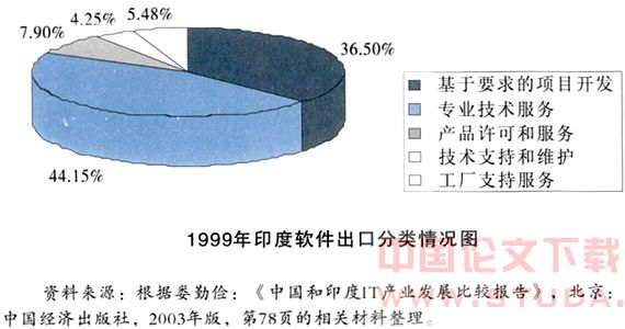 大量的实证研究表明,要想在软件产业这样的全球竞争性产业中获得成功,很重要的一点就是速度,换句话说,“时间就是市场”。尽管印度的软件产业在近年来迅猛发展,然而,大部分增长实际上都是由低附加价值业务驱动的。在整个20世纪80年代和90年代初期,印度几乎完全被限制在软件生产的低附加价值环节,例如编码、检测和维修。大部分这类业务都是采用海外现场服务,即劳务输出的形式完成的。虽然现在更多的工作都是离岸的,而且,一些大型跨国公司也已经开始提供较高附加价值的设计业务,不过,印度的大多数软件业务和“及时采购”并没有太大的区别。因此,如果考虑到印度软件产业的出口业务构成情况(如下图所示),我们甚至可以认为,敬业的文化是影响印度软件产业发展的最重要的文化因素。
