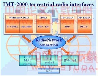为了支持多媒体业务和全球无缝漫游,90年代初,一些标准化组织就已经对3G进行研究。在1999年10月的ITU芬兰会议上,3G(即 IMT-2000)的无线接口技术规范(如图4)获得通过,标志着第三代技术的格局最终确定。它分为CDMA和TDMA两大类共五种技术,其中主流技术为三种CDMA技术:CDMA-DS(直接扩频)即欧洲和日本共同提出的WCDMA技术;CDMA-MC(多载波)即美国提出的cdma2000技术;CDMA-TDD(时分双工)包括我国提出的TD-SCDMA和欧洲提出的UTRA TDD。这些标准的制定主要靠3GPP和3GPP2两个国际组织。