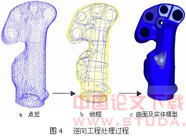 如何得到部件精确的电子数据模型,是CA精铸至关重要的第一步。随着三维CAD软件、逆向工程等技术的发展,这项工作变得简单而且迅捷。在此主要介绍利用IDEAS进行实体建模和数据转换的过程。IDEAS9集成了三维建模与逆向工程建模模块。通过MasterModeler模块可以得到复杂模型(见图2),既可以进行全几何约束的参数化设计,又可进行任意几何与工程约束的自由创新设计;曲面设计提供了包括变量扫掠、边界曲面等多种自由曲面的造型功能。逆向工程Freeform可将数字化仪采集的点云信息进行处理,创建出曲线和曲面,进行设计,曲面生成后可直接生成RPM用文件,也可传回主建模模块进行处理(见图4)。实体文件生成后需转变成STL文件(见图3)以作为RP设备的输入。转换过程应注意选择成型设备名称,通常选用SLA500,三角片输出精度在0.005~0.01之间。采用MagicRp处理时应注意乘上25.4,得到实际设计尺寸。